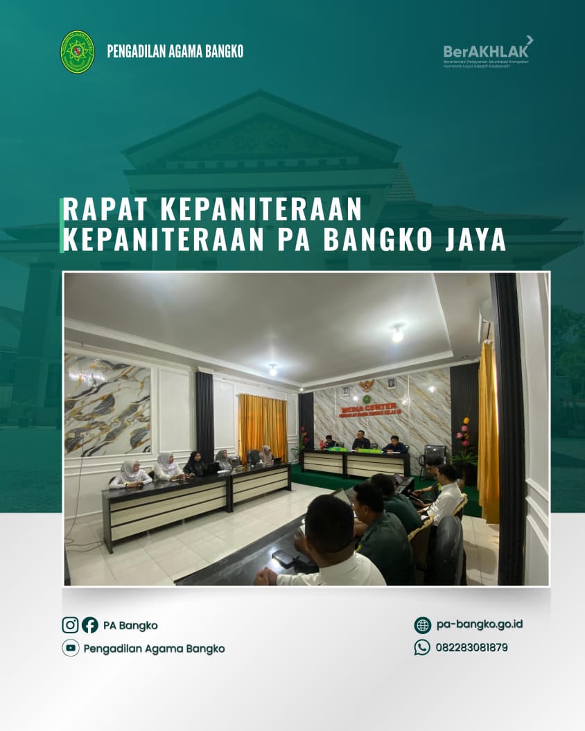 15 April 2026, Kepaniteraan PA Bangko mengadakan rapat kepaniteraan yang dipimpin oleh Sanusi Pane, S.H.I., M.H, didampingi Panitera Muda Hukum Zari Wardana, S.H.I., M.Sy., dan Panitera Muda Permohonan Benny Suryanto, S.H.I, beserta seluruh pegawai kepaniteraan PA Bangko.