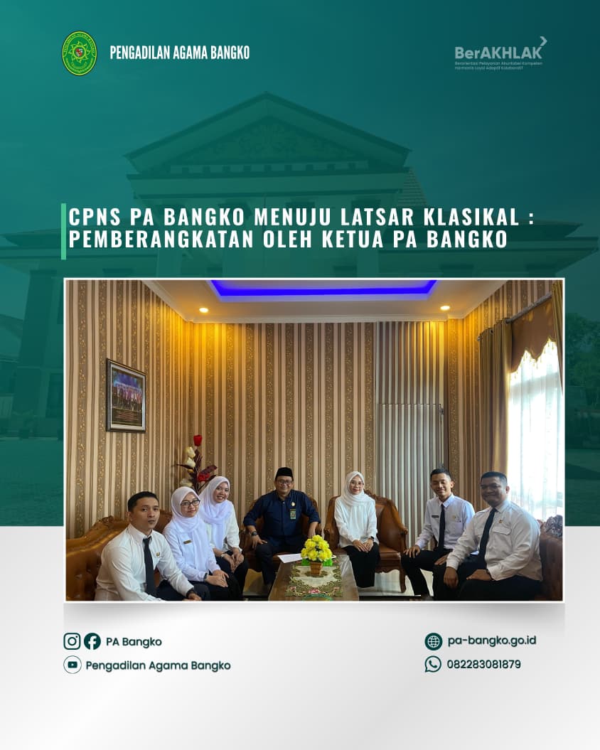 Semangat baru, langkah baru! Dalam rangka Pelatihan Dasar (Latsar) Klasikal MA RI Gel. 2 Tahun 2026, CPNS PA Bangko akan berangkat ke Badan Strategi Kebijakan dan Pendidikan dan Pelatihan Hukum dan Peradilan (BSDK) di Megamendung, Bogor.