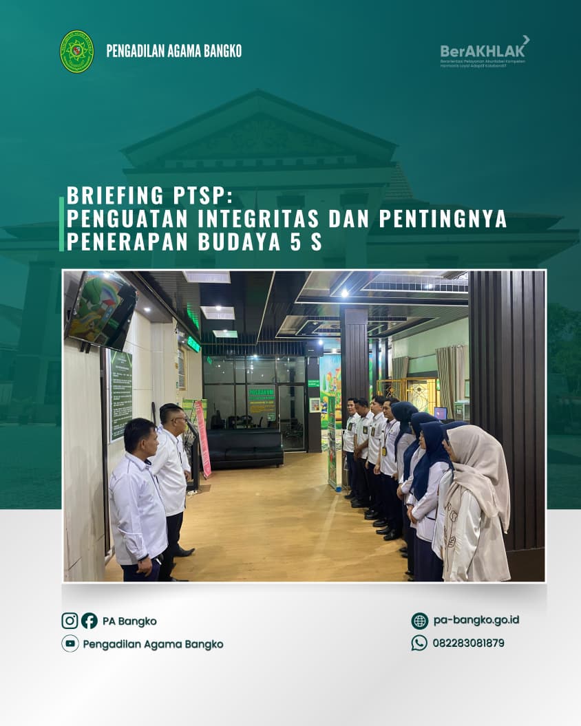 BANGKO – Sebagai garda terdepan dalam memberikan pelayanan kepada masyarakat pencari keadilan, jajaran petugas Pelayanan Terpadu Satu Pintu (PTSP) Pengadilan Agama Bangko kembali mengikuti kegiatan briefing rutin pada pagi hari ini. Bertempat di ruang tunggu PTSP, kegiatan ini dipimpin langsung oleh Panitera PA Bangko, Bapak Sanusi Pane, S.H., M.H.